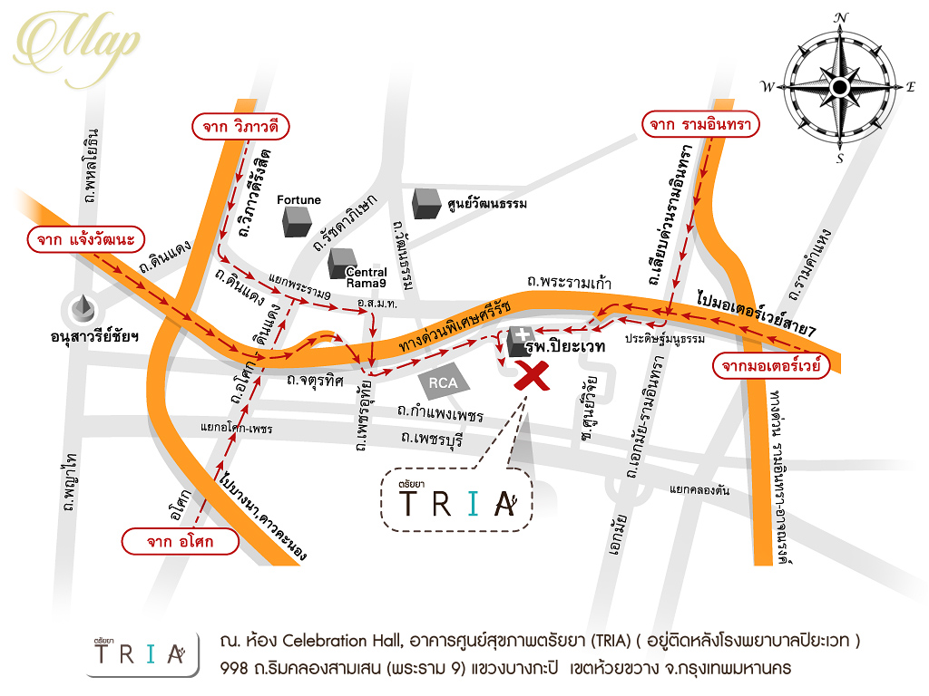 จากฝั่งตะวันตก ให้มุ่งหน้าเข้าสู่ถนนดินแดง วิ่งข้างล่างจนถึงแยก อ.ส.ม.ท ให้เลี้ยวขวา และเลี้ยวซ้ายใต้ทางด่วน ขับผ่านหน้า RCA (ฝั่งพระรามเก้า) ไปจนเห็นป้าย TRIA ก็ไปตามป้ายได้เลย เลี้ยวขวาตรงที่กลับรถ จะผ่านโรงพยาบาลปิยะเวทเข้าไป ก็จะเจอ
